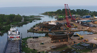 About 275 people work at the yard on a daily basis, Rice said, and the yard is always hiring. He said Master Boat has 11 ships under contract, eight of which are in the works. At the moment, much of the yard is taken up with a series of tugs destined for service in Texas. The first was delivered this month, Rice said, and the second was in the water. On this visit, the third was upright and looking like a near-complete ship, with its two Z-Drive units being installed. The fourth was right-side-up, but unpainted and lacking its superstructure. The fifth was upside-down, the way Master Boat likes to start its hulls, making gravity a friend as hull plates are welded onto frames. On the sixth, more of the skeleton was visible and the bow section hadn’t yet been grafted on.